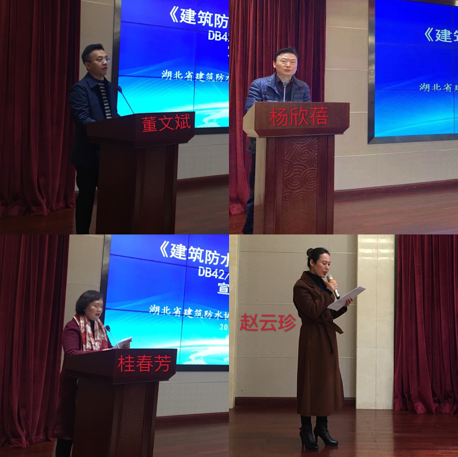 参加本次会议的领导和授课专家有湖北省建设工程质量安全监督总站副站长董文斌、湖北省建筑防水协会会长桂春芳、湖北省勘察设计协会秘书长杨欣蓓、武汉理工大学建筑学院副院长邱红胜、湖北省建筑设计院副院长李跃、中建三局第一建设工程有限公司总经理李斌、湖北工业大学土木建筑与环境学院防水材料与工程专业教师江波、武汉舒宁防水技术有限公司总经理程时勤。会议由湖北省建筑防水协会会员赵云珍主持。
